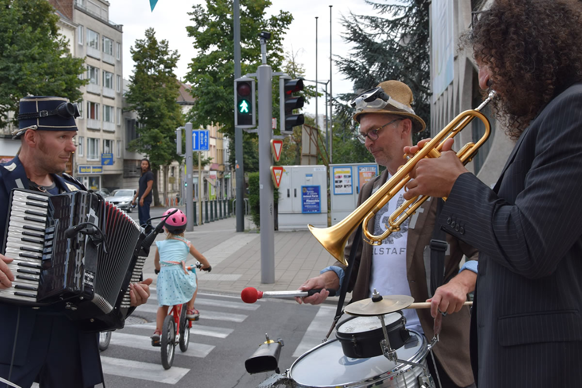 Far Fare is an experimental mini marching band. With accordion, percussion and trumpet, the trio moves from dub and reggae to balkan, bossa and musette. Improvising and on the go, they tailor their repertoire to the audience's reaction - adventurous or accessible, discreet or interactive.